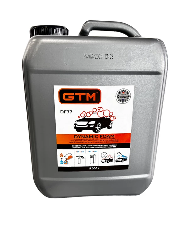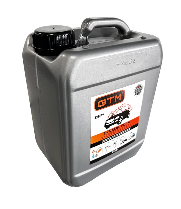 GTM Dynamic Foam DF77 - високоефективний засіб для очищення поверхні від забруднень усіх видів. Відноситься до преміального сегменту активної піни і виділяється підвищеною миючою здатністю через збільшену концентрацію хімічно активних речовин. Застосовується для всіх видів безконтактного миття автомобілів, велосипедів та мотоциклів. Надає поверхні блиску без розлучень. Піна безпечна для лакофарбового покриття, пластмас, гуми та металів.