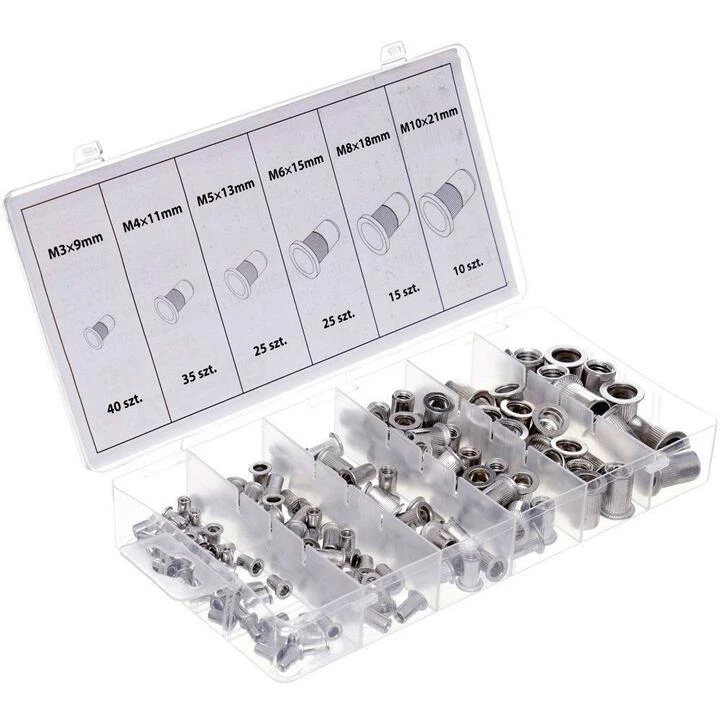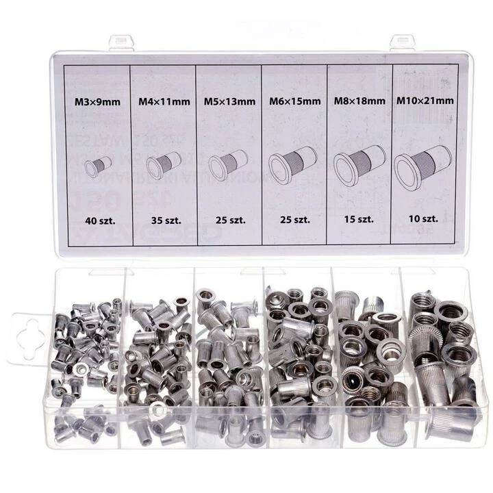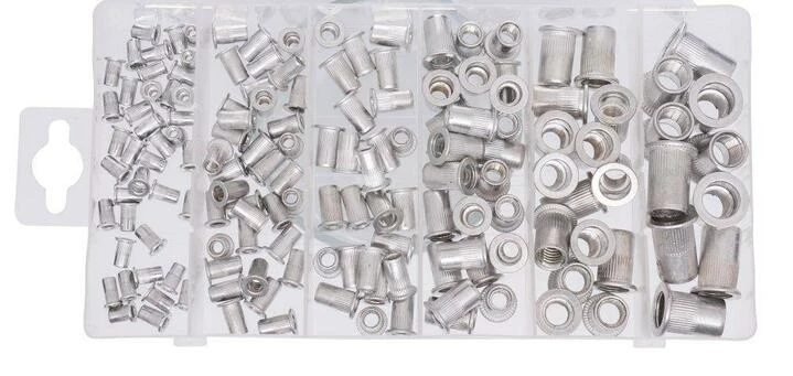 Алюмінієві заклепки, 150 шт TAGRED TA4095- мають циліндричний рифлений фланець, завдяки чому вони більш щільно прилягають. Заклепки дозволяють вкручувати гвинт або болт з метричною різьбою в листовий метал або інші матеріали, де неможливо зробити різьбу.