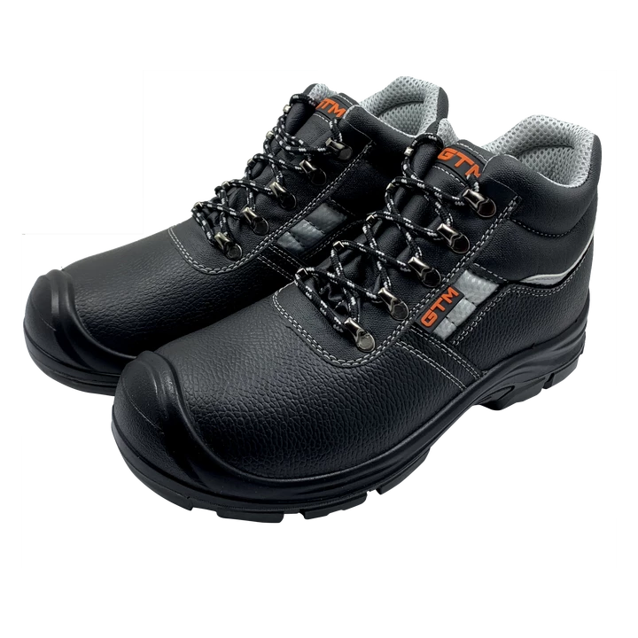 Будівельні черевики GTM SM-070 - зручна робоче взуття для повсякденного використання з захисним сталевим носком, який витримує ударне навантаження до 200 Дж. Верх черевик виготовлений з натуральної шкіри і доповнений спеціальними світловідбиваючими вставками. Підошва: поліуретанова, двошаровий, лита. Має діелектричну, антистатичну і антиковзну обробку. Стійка до впливу масел, палива, агресивним розчинів кислот і лугів з концентрацією до 20% і контактному нагрівання до 110 С. Носок в черевиках має додаткову сталеву вставку, яка витримує ударне навантаження до 200 Дж. Енергопоглинаюча дихаюча устілка з прошивкою проти ковзання.