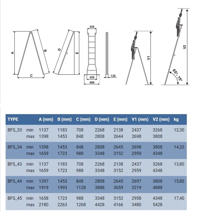 Максимальна робоча висота залежить від зростання користувача і становить близько 3,5 м у режимі драбини та 5,4 м у режимі сходів