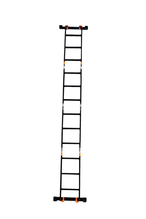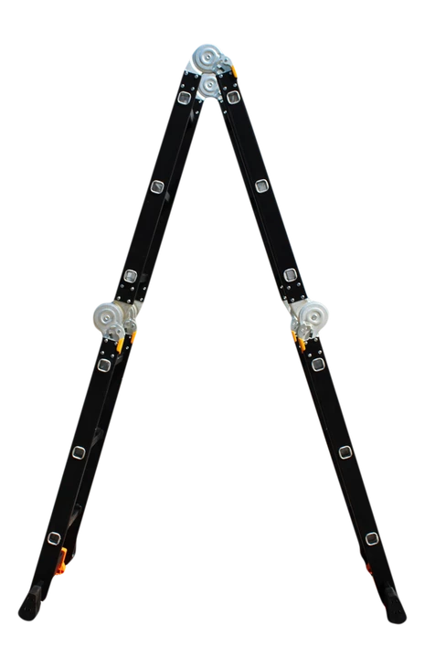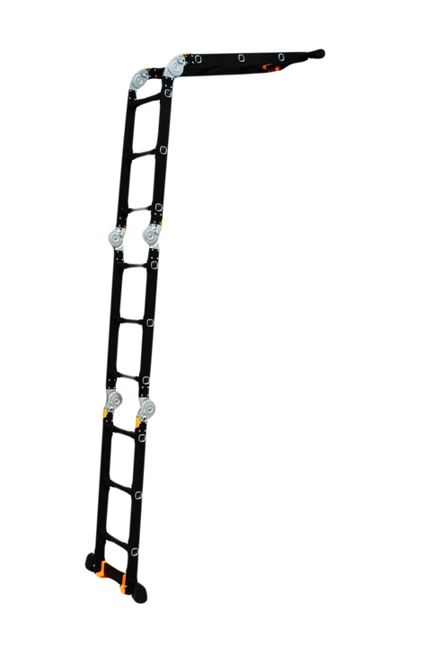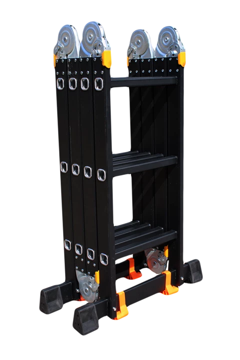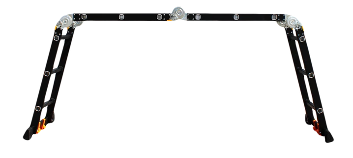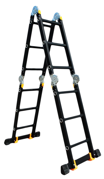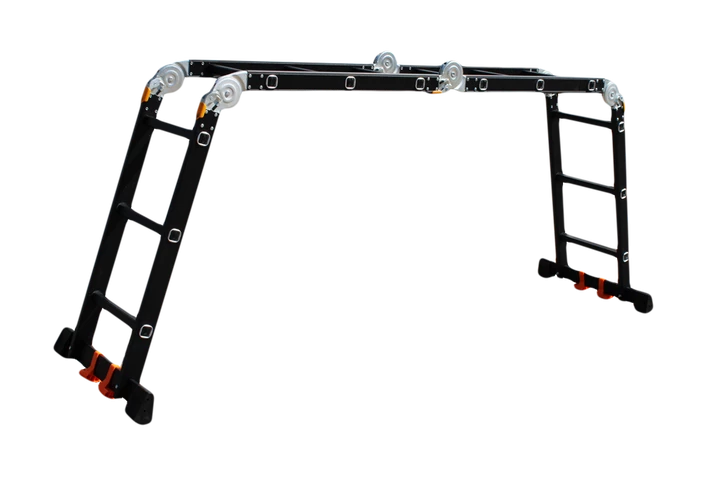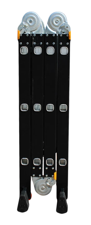 GTM KMP403A - легка драбина-трансформер підвищеної міцності, яка призначається для постійного промислового і побутового використання. Профіль виготовлений з авіаційного алюмінію, має змінну товщину стінки і додатково посилений ребрами жорсткості. Для додаткової стійкості до пошкоджень корпус пофарбований в чорний колір методом електрофорезу. Міцні шарніри і замки надійно фіксують сходи в будь-який з обраних форм. Завдяки такій конструкції трансформер GTM KMP403A здатний витримати без деформації навантаження в 150 кг.