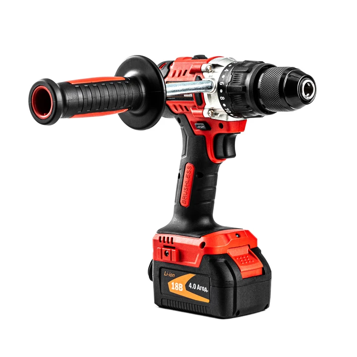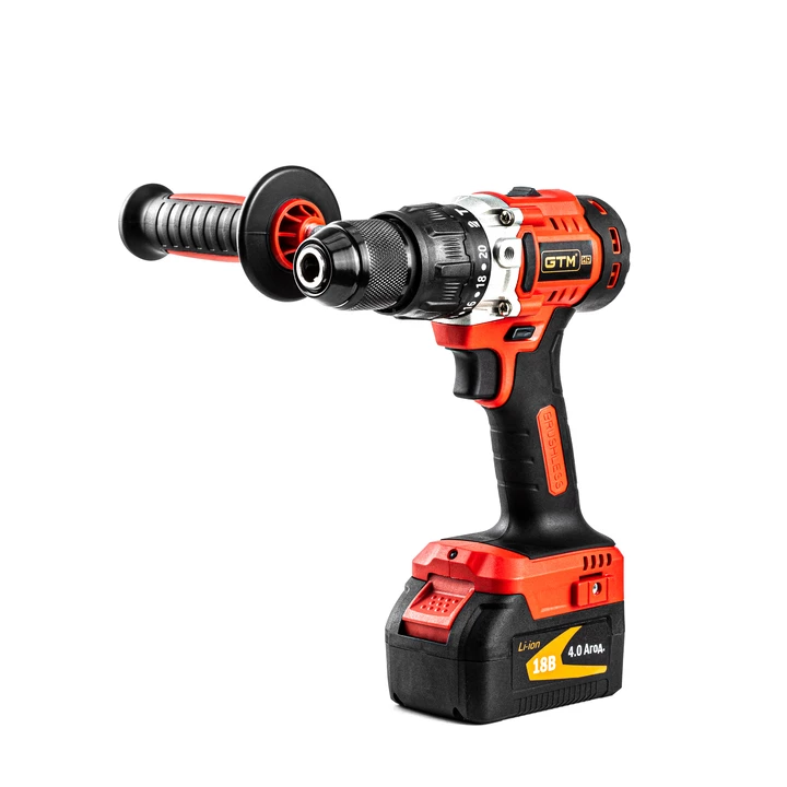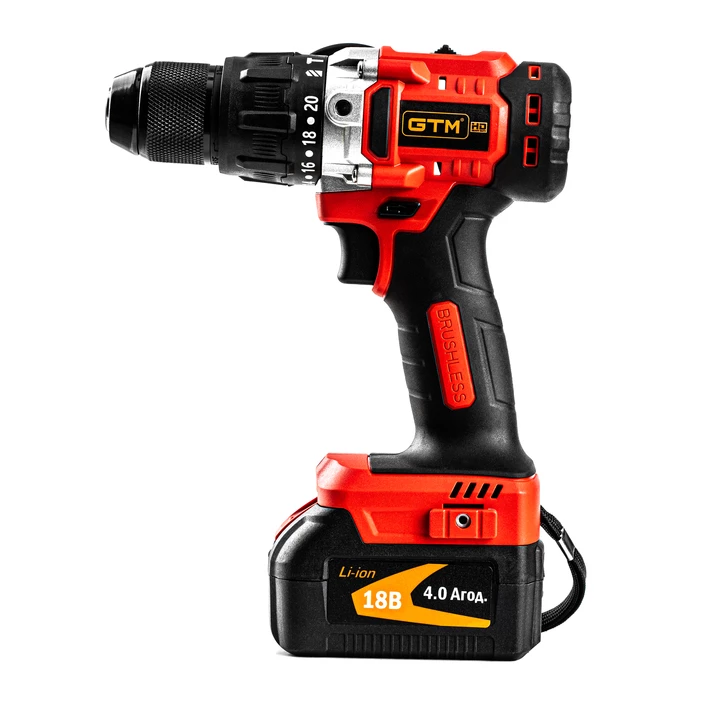 GTM DSI18/80BL - безщітковий дриль-шурупокрут професійного класу з живленням від Li-Ion акумуляторів напругою 18 В. У шурупокруті встановлений повністю металевий швидкозатискний 13 мм патрон для роботи з бітами та свердлами. Редуктор у цій моделі двоступінчастий, що дозволяє регулювати максимальну швидкість залежно від завдання. У даній моделі є 20 режимів для закручування кріплень, з максимальним крутним моментом 80 Н*м, а також є режим свердління і свердління з ударом.