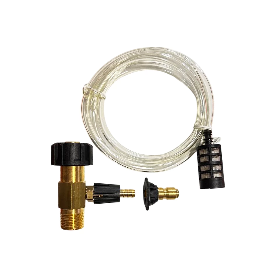 Комплект подачі миючих та хімічних засобів для мийок високого тиску оснащений інжектором, регулятором і трубкою для забору рідини. Забезпечує ефективне змішування води з мийним розчином та зручну подачу під час роботи.
