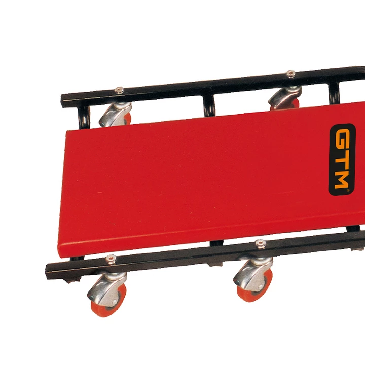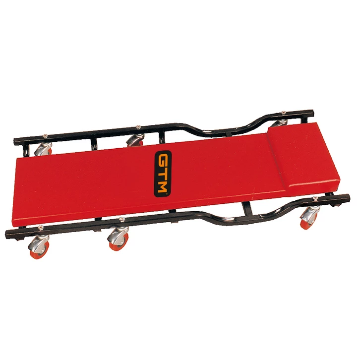 Лежак автослюсаря підкатний з відкидним підголовником GTM TRH6455 має посилений сталевий каркас з квадратного металевого профілю, покриття - порошкове. Матеріал поверхні - мастилостійкий вініл, а товста пінопластова прокладка забезпечує комфорт майстра під час роботи.