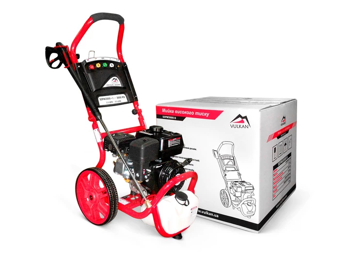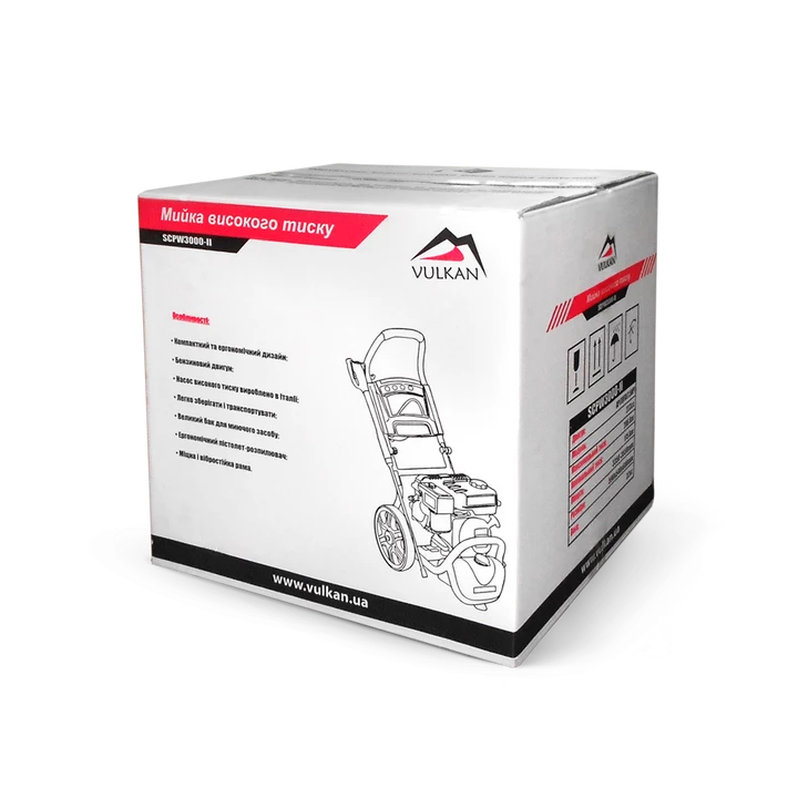 Мийка високого тиску Vulkan SCPW 3000-II - професійний мийний апарат на бензиновому двигуні потужністю 6,5 л. с. Дана модель активно використовується у сфері технічного обслуговування, на виробництві, в роботі комунальних служб і клінінгових компаній. Додатково мийку можна оснастити пінної насадкою або фрезу.