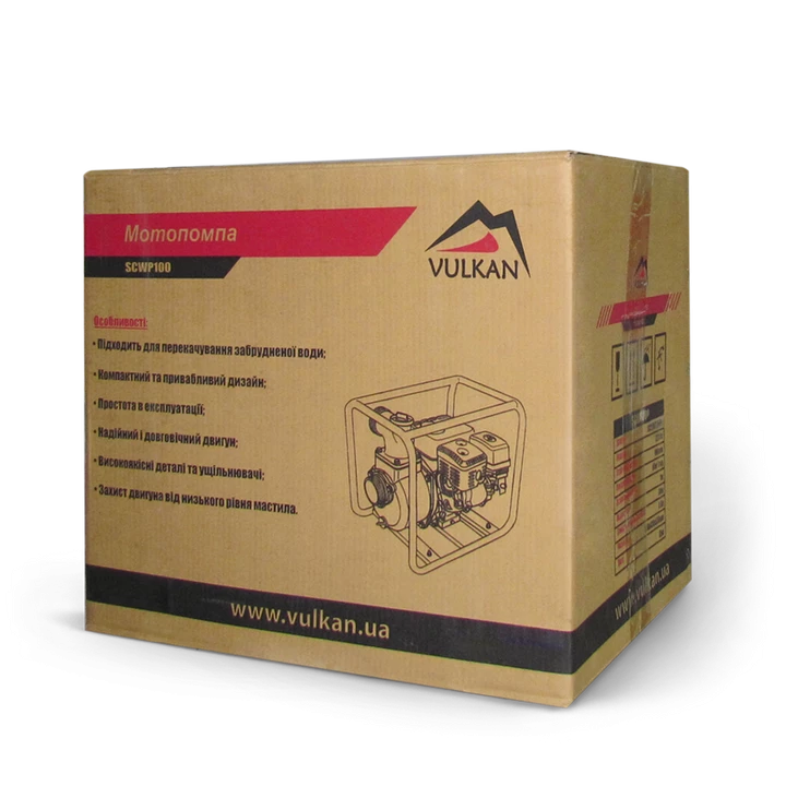 Мотопомпа Vulkan SCWP100 — продуктивна бензинова установка, призначена для перекачування чистої води у великих об?ємах. Оптимально підходить для зрошення значних територій, поливу в садово-городніх роботах, осушення колодязів і водойм, а також під час ремонтно-будівельних робіт.
