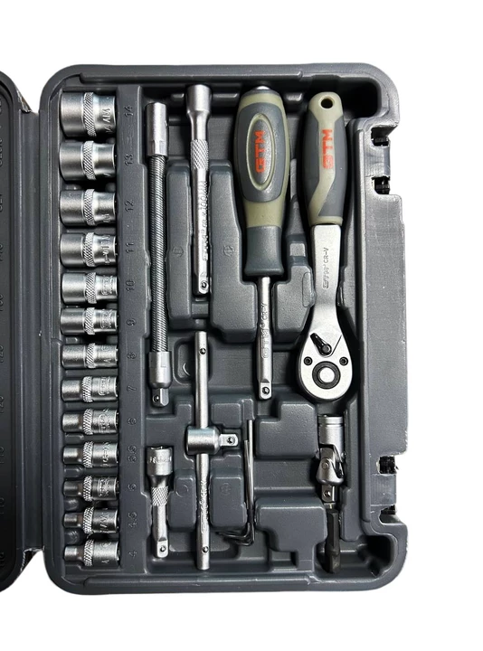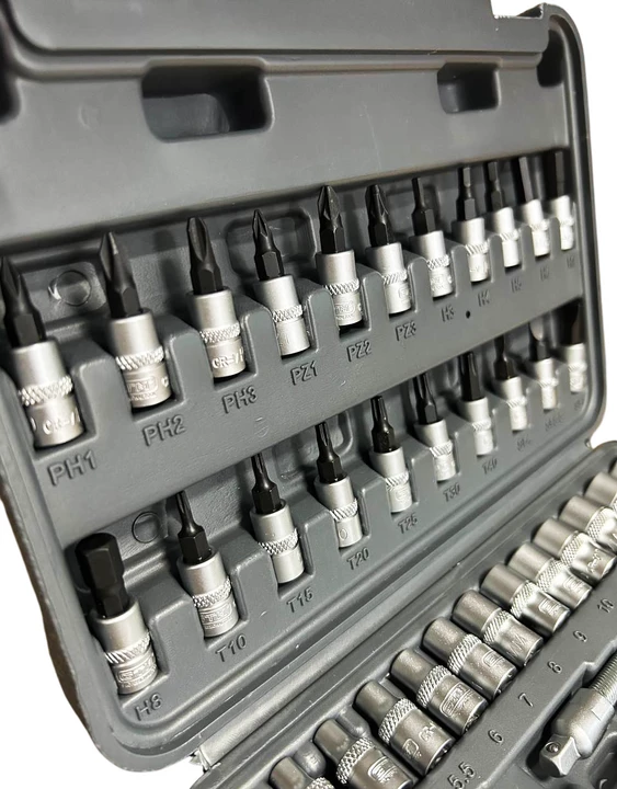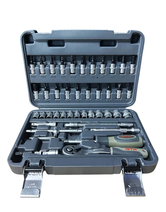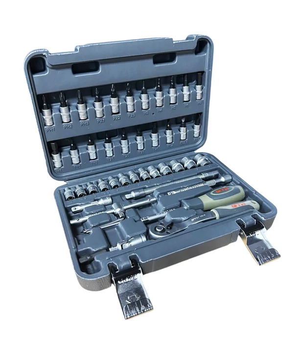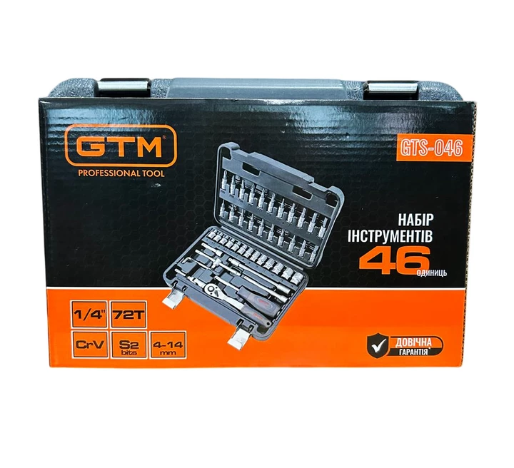 Набір інструменту 46од. 1/4" 4-14мм пластик. кейс — універсальне рішення для роботи з різьбовими з’єднаннями, дрібного ремонту, монтажу та сервісних робіт. Усі елементи виготовлені з високоякісної хромванадієвої сталі (CrV), що забезпечує підвищену міцність, стійкість до зносу та довгий термін служби. Тріскачка з механізмом на 72 зубці (72Т) гарантує точне та плавне налаштування моменту навіть у важкодоступних місцях. Двокомпонентна ергономічна рукоятка забезпечує комфорт під час роботи та запобігає ковзанню.