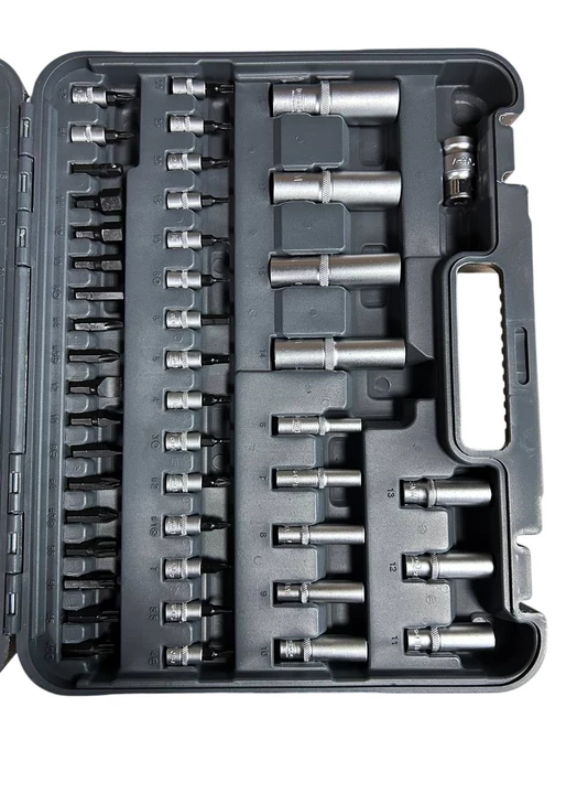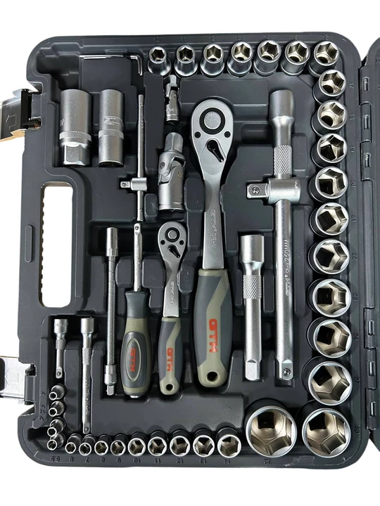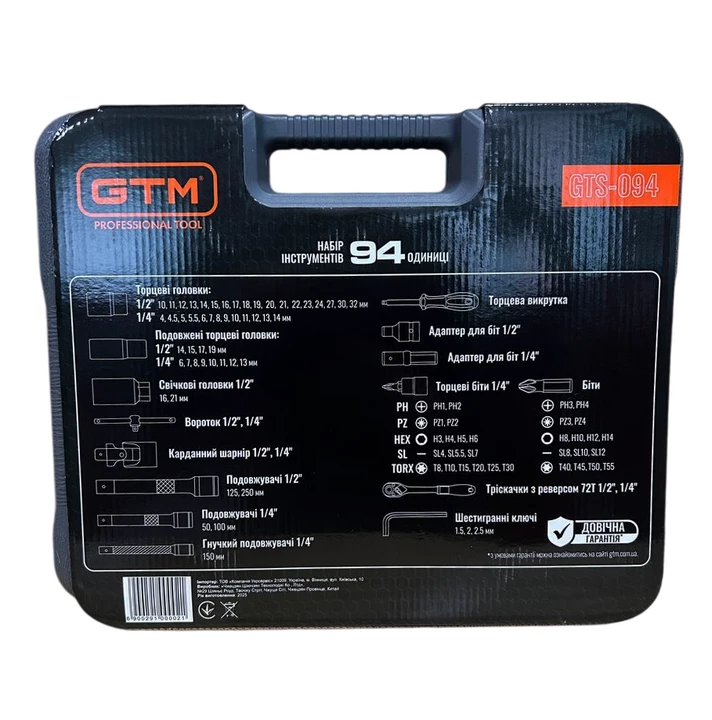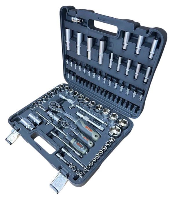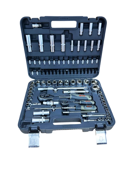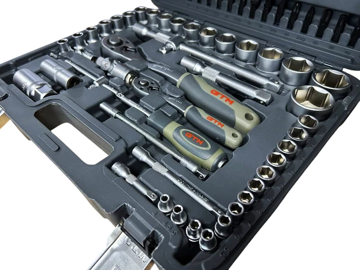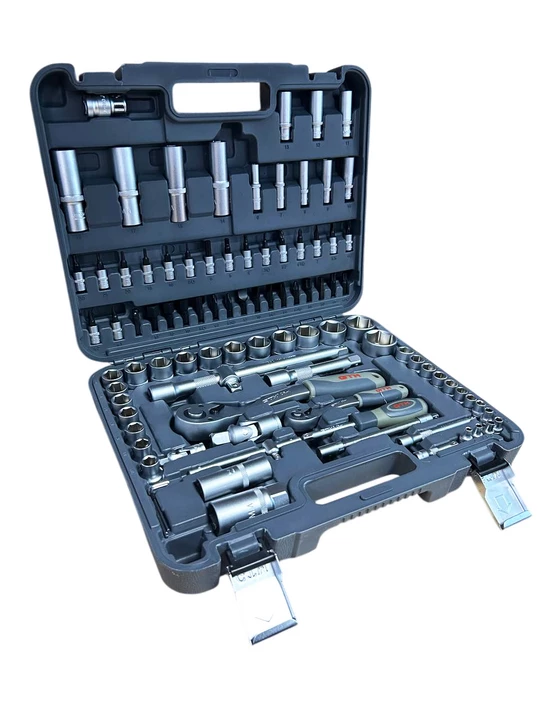 Набір інструменту 94од. 1/2-1/4" 4-32мм пластик. кейс- універсальне рішення для роботи з різьбовими з’єднаннями, дрібного ремонту, монтажу та сервісних робіт. Усі елементи виготовлені з високоякісної хромванадієвої сталі (CrV), що забезпечує підвищену міцність, стійкість до зносу та довгий термін служби. Тріскачка з механізмом на 72 зубці (72Т) гарантує точне та плавне налаштування моменту навіть у важкодоступних місцях. Двокомпонентна ергономічна рукоятка забезпечує комфорт під час роботи та запобігає ковзанню.