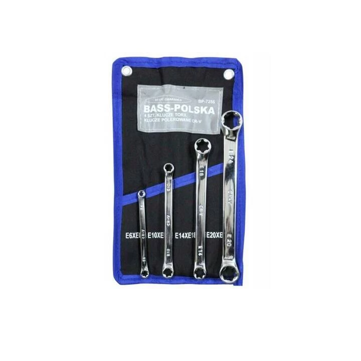 Набір накидних ключів Bass Polska BP-7256 - складається з чотирьох ключів, виготовлених з хромованадієвої сталі, що забезпечує тривалий термін служби та надійність. Сатиноване покриття ключів допомагає запобігти зісковзуванню. Ці міцні ключі Torx забезпечують кращу передачу моменту, ніж шестигранні ключі. Весь набір зручно розміщено у футлярі з номерами ключів та отворами для підвішування на стіну. Технічні характеристики включають такі розміри ключів Torx: E6 x E8, E10 x E12, E14 x E18, E20 x E24, при довжині від 115 мм до 120 мм, виготовлені зі сталі CrV.