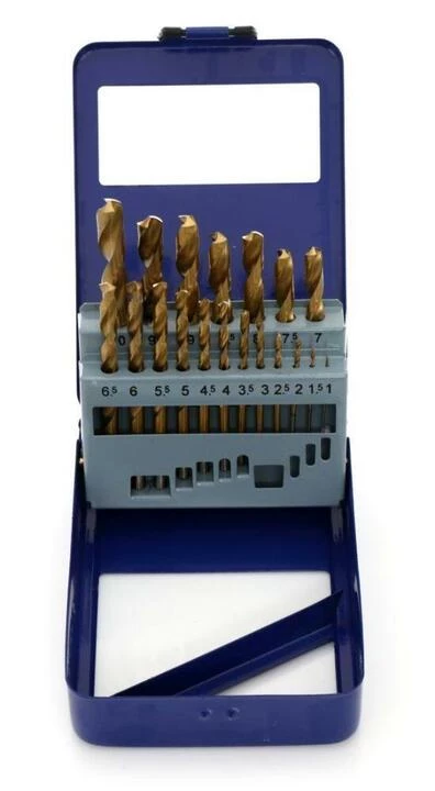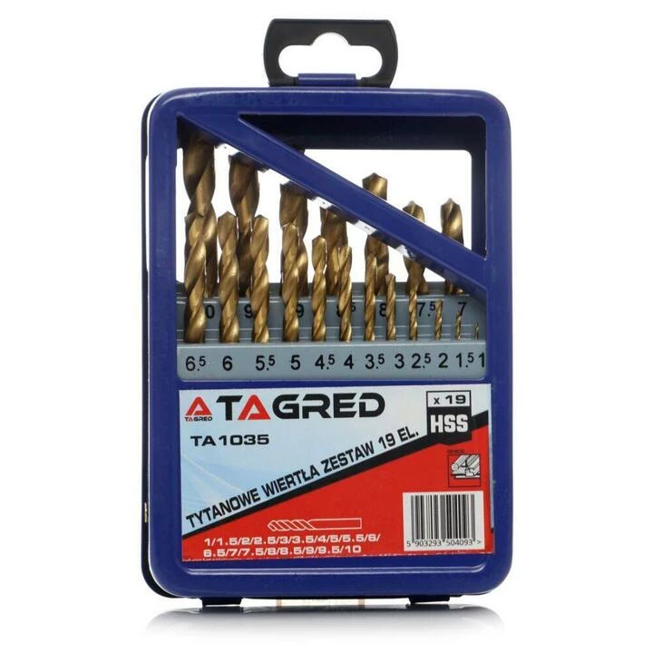 Набір свердл по металу TAGRED TA1035, 19 шт - рекомендовані для використання в майстернях, для обробки легованих і вуглецевих сталей підвищеної твердості, ковкого чавуну, залізних агломератів, кольорових металів і затверділих пластмас. Свердла виготовлені зі швидкоріжучої сталі з твердістю 62°HRc (+/-2°), кутом загострення 118°, прямим заточуванням без корекції зсуву, придатні для ручного заточування.