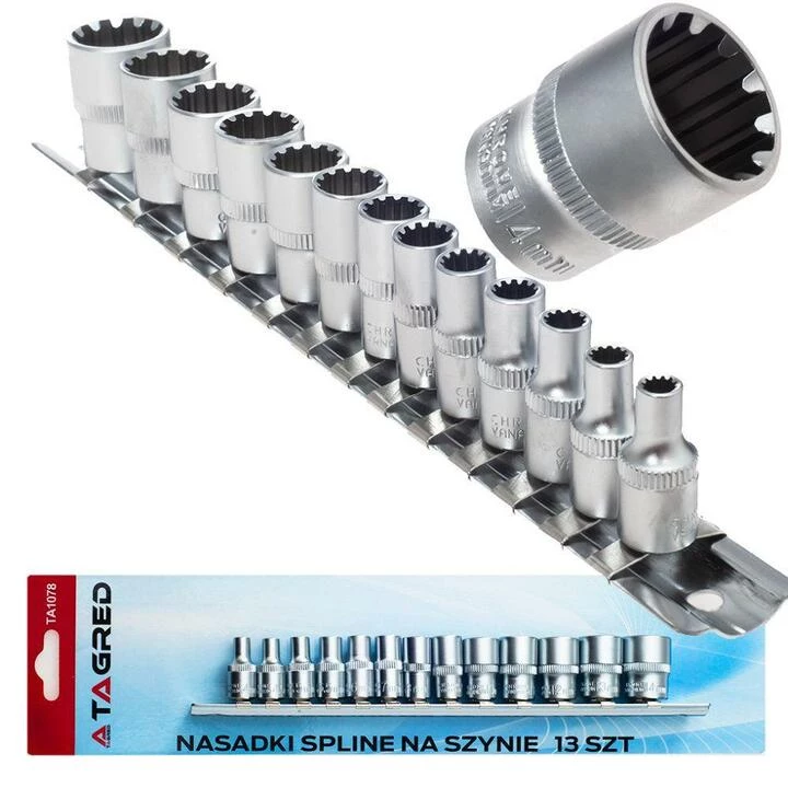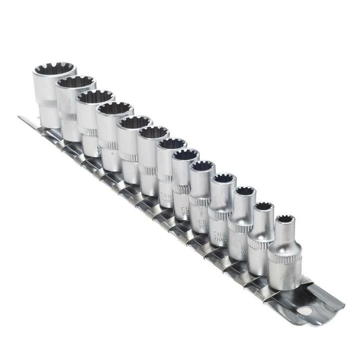 Всі елементи набору виготовлені з високоякісної Cr-V сталі. У комплект входить рейка, яку можна закріпити на стіні.