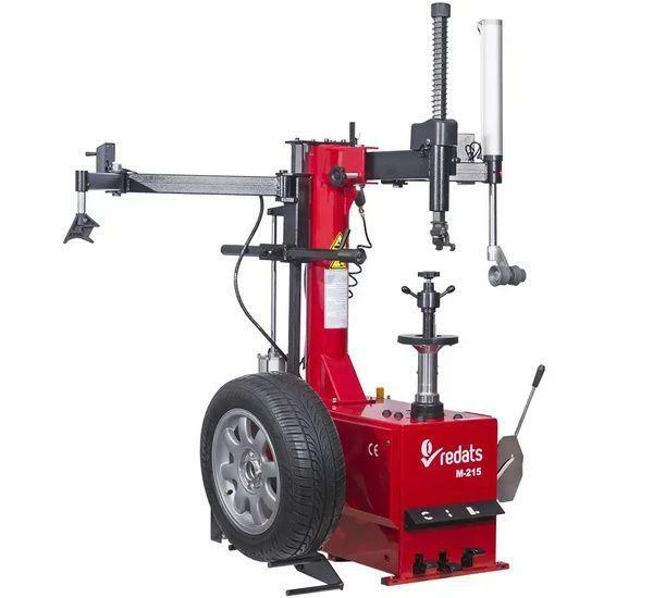 Напівавтоматичний шиномонтажний верстат з підйомною стрілою REDATS M-215 призначений для роботи з шинами легкових автомобілів, у тому числі низькопрофільними та RunFlat. Особливістю моделі є відсутність традиційного монтажного столу: колесо встановлюється на обертовий вал з регульованою різьбою і фіксується за допомогою швидкознімної барашкової гайки. Верстат дозволяє працювати з колесами діаметром 8-28”, шириною до 406 мм. Потужність двигуна становить 1,1 кВт, живлення від трифазної мережі. Робочий тиск - 8-10 Бар.