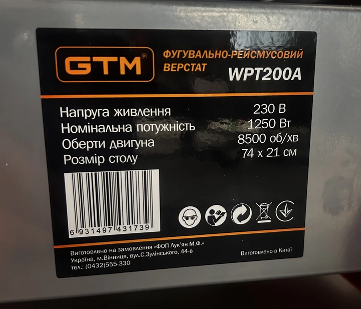 GTM WPT200A - компактний деревообробний верстат побутового класу. Поєднує в собі відразу два пристрої: фугувальний верстат і рейсмус. Дає змогу отримати на виході гладкі дерев'яні заготовки або дошки шириною до 204 мм і висотою до 120 мм. Працює від побутової електричної мережі 220 В і споживає всього 1250 Вт.