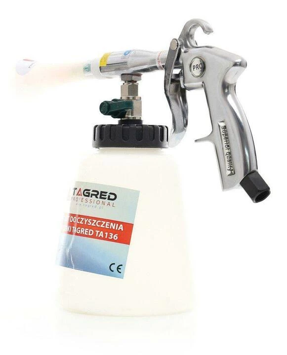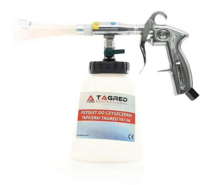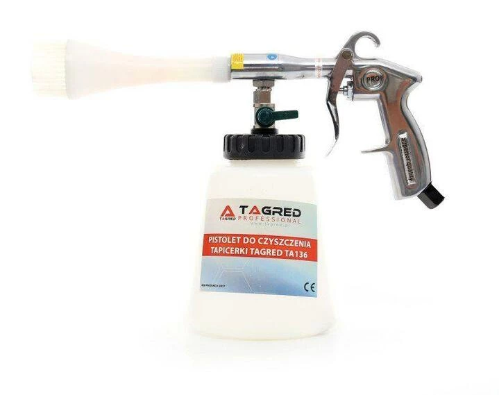 Пістолет пневматичний для очищення поверхонь TAGRED TA136 призначений для вологого очищення кузова та салону автомобіля, напр. вентиляційні отвори, кондиціонери, дзеркальні та пластикові елементи, сидіння, оббивка, килими.