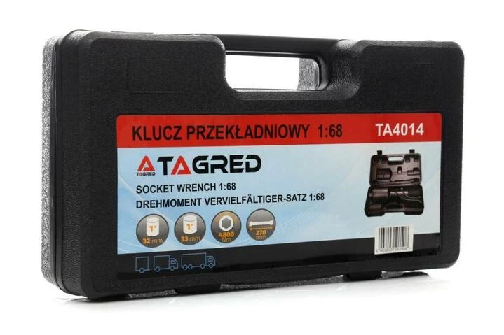 Планетарний зубчастий ключ для коліс TAGRED TA4014 - це професійний, надійний інструмент, рекомендований скрізь, де доводиться мати справу з сильно затягнутими кріпильними болтами. Завдяки своїм компактним розмірам і в простоті використання цей інструмент стає незамінним аксесуаром для кожної вантажівки, TIR і різних типів сільськогосподарських або будівельних транспортних засобів і машин. Завдяки своїй конструкції, ключ може бути адаптований практично до всіх поширених коліс вантажівок. Шпиндель сумісний з торцевими головками 1". У комплекті є дві високоякісні торцеві головки 32 мм і 33 мм.