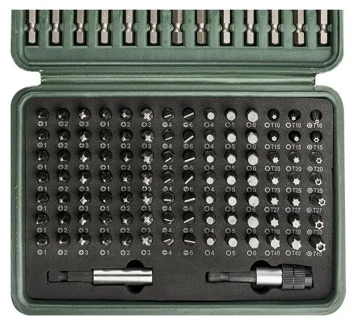 Біти в наборі підходять для більшості сучасних гвинтів, включаючи плоскі, шпинделі PH і PZ, шестигранники, а також Torx та Torx із захистом.