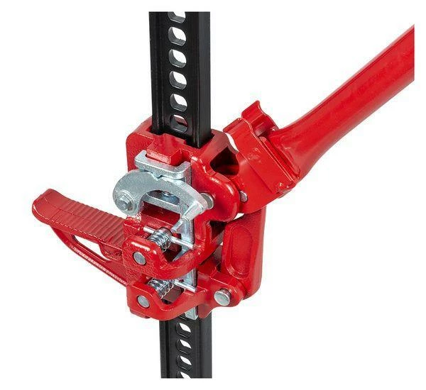 Перфорована рейка двотаврового профілю виготовлена зі спеціального сталевого сплаву з високим опором на вигин. Калібровані отвори розташовані з чіткий кроком по всій довжині. Кроковий підйомний механізм, який складається з чавунного корпусу та двох загартованих сталевих штифтів, зберігає точність і надійність у будь-яких умовах. Перемикач напрямку (підйом/опускання) виготовлений з товстої сталі, має потужну пружину і чітку механічну фіксацію. Завдяки шарнірній опорній п’яті цей домкрат для витягування авто зберігає стійкість навіть на нерівних поверхнях.