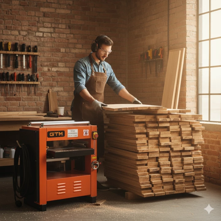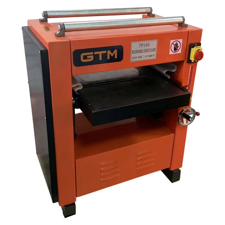 GTM TP104 - професійне обладнання для обробки деревини. Рейсмусовий верстат TP104 призначається для чистового стругання дощок під задану товщину. Знімання деревини здійснюється 4 ножами із загартованої сталі, які закріплені на обертовому валу з діаметром 77 мм. Верстат GTM TP104 здатний працювати з дошками шириною до 400 мм і товщиною від 10 мм до 120 мм. Товщина при роботі регулюється за допомогою важеля з фіксацією і мірної лінійки. Швидкість подачі заготовки сягає 13,5 м / хв. Для роботи з великогабаритними дошками є можливість під'єднати спеціальне подовження.