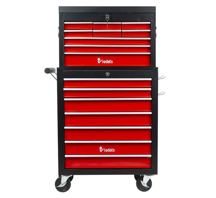 Візок REDATS COMPACT BLACK - це дворівнева модульна конструкція для організованого зберігання і переміщення інструментів, яка складається з 2 частин: нижнього візка з 7 місткими шухлядами (2 верхні 511x278x54 мм і 5 нижніх 511x278x84 мм) і верхнього бокса з 9 шухлядами (6 розміром 150x225x40 мм, 2 розміром 511x225x40 і 1 розміром 511x225x84 мм), який кріпиться на візок. Всі шухляди оснащені напрямними на кулькових підшипниках, що забезпечує їх легке відкривання-закривання навіть при повному завантаженні.
