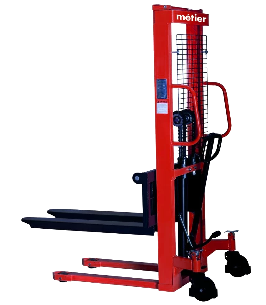 Гідравлічний штабелер Metier - складське обладнання для підняття габаритних вантажів на дерев'яних палетах і укладання їх на стелажі. Дана модель має міцний сталевий корпус червоного кольору. Ширина вил 540 мм. Довжина вил 1.1 м. Максимальне підняття вантажу до 2000 кг на висоту 1.6 м.
