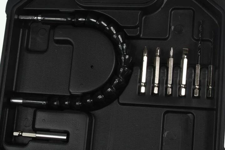 У комплекті до шуруповерта входять різноманітні насадки та біти, що дозволяє вам швидко і зручно виконувати різні завдання. Гнучкий подовжувач у комплекті допоможе отримати доступ до важкодоступних місць.