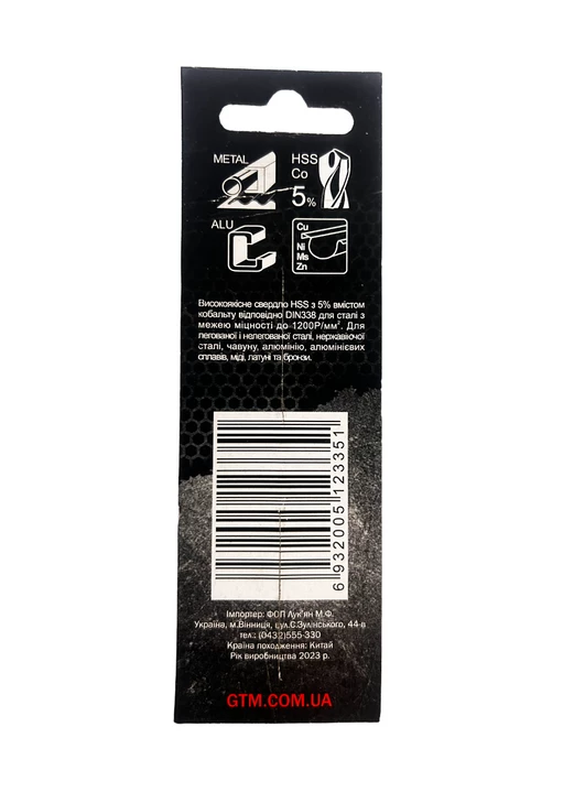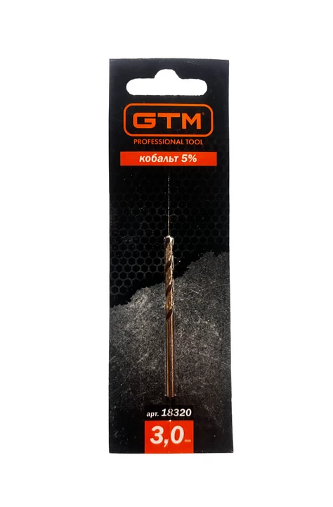 GTM HSS-Co5 3,0 мм - праве спіральне свердло з кутом заточування 135° і двома ріжучими гранями. Серія GTM HSS-Co5 виготовляється з швидкорізальної сталі HSS з додаванням до сплаву 5% кобальту, що значно підвищує зносостійкість та міцність. Даний тип свердл застосовується при бурінні отворів у легованих та звичайних сталях, кольорових металах та пластику. При використанні охолодження термін служби свердла збільшується у 6 разів.