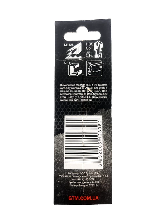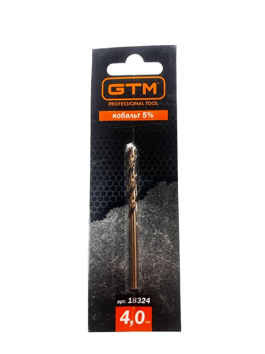 GTM HSS-Co5 4,0 мм - праве спіральне свердло з кутом заточування 135° і двома ріжучими гранями. Серія GTM HSS-Co5 виготовляється з швидкорізальної сталі HSS з додаванням до сплаву 5% кобальту, що значно підвищує зносостійкість та міцність. Даний тип свердл застосовується при бурінні отворів у легованих та звичайних сталях, кольорових металах та пластику. При використанні охолодження термін служби свердла збільшується у 6 разів.