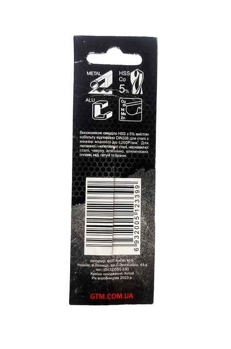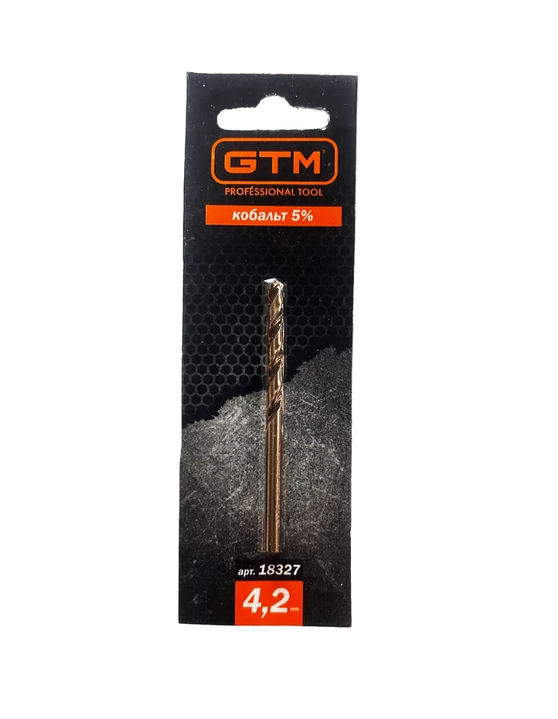 GTM HSS-Co5 4,2 мм - праве спіральне свердло з кутом заточування 135° і двома ріжучими гранями. Серія GTM HSS-Co5 виготовляється з швидкорізальної сталі HSS з додаванням до сплаву 5% кобальту, що значно підвищує зносостійкість та міцність. Даний тип свердл застосовується при бурінні отворів у легованих та звичайних сталях, кольорових металах та пластику. При використанні охолодження термін служби свердла збільшується у 6 разів.