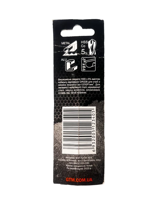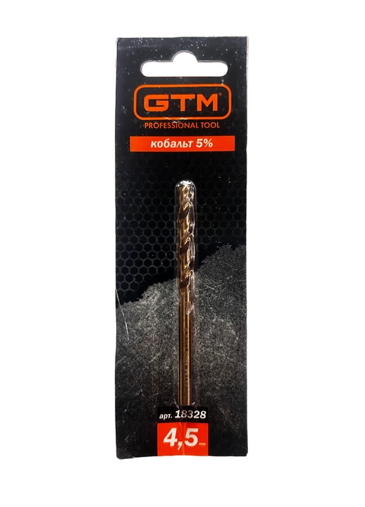 GTM HSS-Co5 4,5 мм - праве спіральне свердло з кутом заточування 135° і двома ріжучими гранями. Серія GTM HSS-Co5 виготовляється з швидкорізальної сталі HSS з додаванням до сплаву 5% кобальту, що значно підвищує зносостійкість та міцність. Даний тип свердл застосовується при бурінні отворів у легованих та звичайних сталях, кольорових металах та пластику. При використанні охолодження термін служби свердла збільшується у 6 разів.