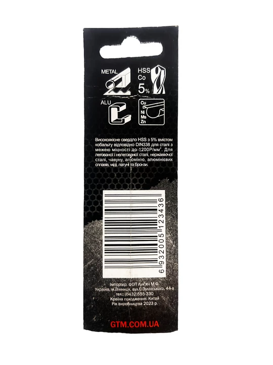 GTM HSS-Co5 6,0 мм - праве спіральне свердло з кутом заточування 135° і двома ріжучими гранями. Серія GTM HSS-Co5 виготовляється з швидкорізальної сталі HSS з додаванням до сплаву 5% кобальту, що значно підвищує зносостійкість та міцність. Даний тип свердл застосовується при бурінні отворів у легованих та звичайних сталях, кольорових металах та пластику. При використанні охолодження термін служби свердла збільшується у 6 разів.