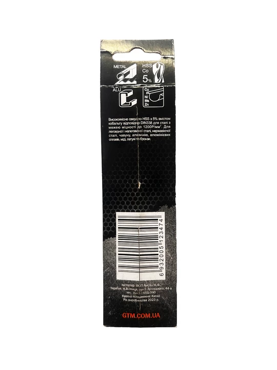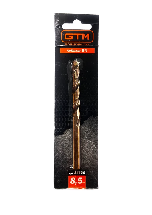 GTM HSS-Co5 8,5 мм - праве спіральне свердло з кутом заточування 135° і двома ріжучими гранями. Серія GTM HSS-Co5 виготовляється з швидкорізальної сталі HSS з додаванням до сплаву 5% кобальту, що значно підвищує зносостійкість та міцність. Даний тип свердл застосовується при бурінні отворів у легованих та звичайних сталях, кольорових металах та пластику. При використанні охолодження термін служби свердла збільшується у 6 разів.