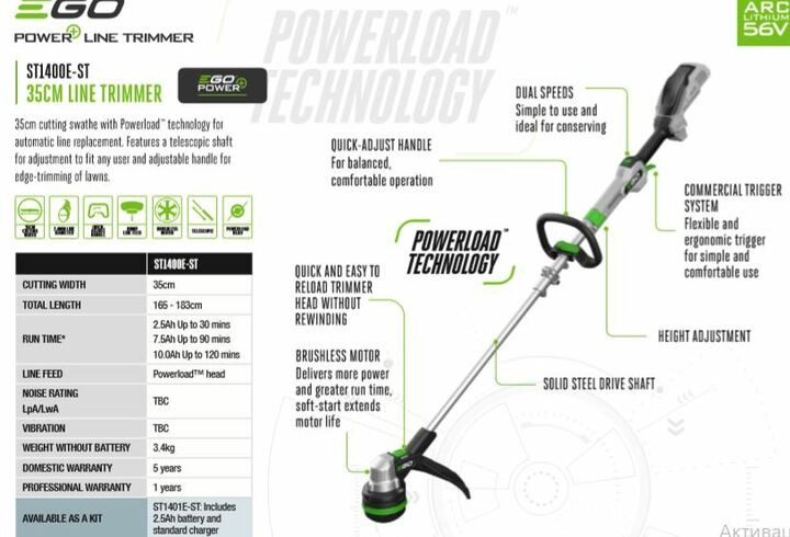 EGO ST1400E-ST - потужний та надійний інструмент, розроблений для догляду за газонами невеликої площі. Ширина захоплення при роботі становить 35 см, чого більш ніж достатньо для побутового використання. Високу потужність та продуктивність тримера забезпечує безщітковий двигун, який живиться від Li-ion акумуляторів EGO 56V. Тример має 2 робочі швидкості, тому здатний впоратися також з бур'янами на ділянці. Завдяки високій ефективності двигуна, однієї батареї на 2.5 А * год вистачає на 30 хвилин безперервної роботи. Відмінністю даної моделі тримера від іншої лінійки EGO є особлива конструкція штанги, довжина якої регулюється під зростання користувача, а також при транспортуванні її можна скласти, що значно економить місце.