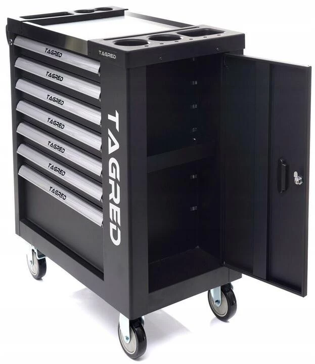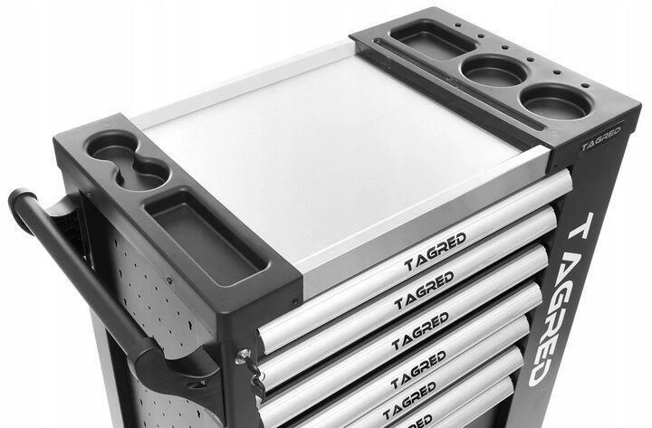 Візок для майстерні TAGRED TA213 з 7 висувними ящиками на кулькових підшипниках і сталевою стільницею відмінно підійде для зберігання інструменту у професійній майстерні, на автосервісі чи у власному гаражі. Велика місткість дозволяє зручно розташувати інструменти, а міцні матеріали виготовлення і додатково укріплені кути забезпечують довготривалу, надійну службу.