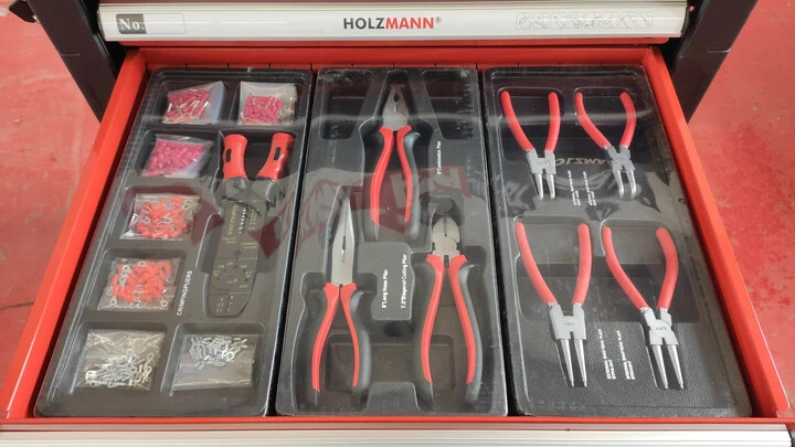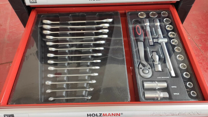 Інструменти виготовлені з хромованадієвої сталі, яка має високу міцність і стійкість до зносу. Всі предмети зручно розсортовані у 7 великих ящиках на шарикопідшипниках, розмір яких збільшується зверху донизу. Корпус візка має посилену конструкцію зі сталі з антикорозійним покриттям, що забезпечує його надійність і тривалий термін служби. Колеса і зручна ручка дозволяють легко транспортувати візок по майстерні, а за допомогою системи блокування можна встановити його у зручному місці. Holzmann WW 790W в наявності в інтернет-магазині офіційного постачальника виробника в Україні KMA.UA.