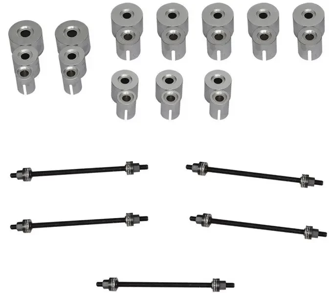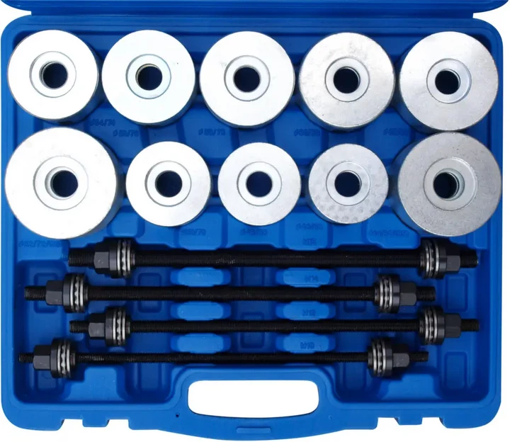 Універсальний набір з 24 предметів для професійного демонтажу та монтажу різних компонентів підвіски. Цей набір дозволяє легко та безпечно працювати з гумовими, кульковими та безшумними підшипниками, гумовими втулками та ущільненнями, без ризику пошкодження суміжних деталей.